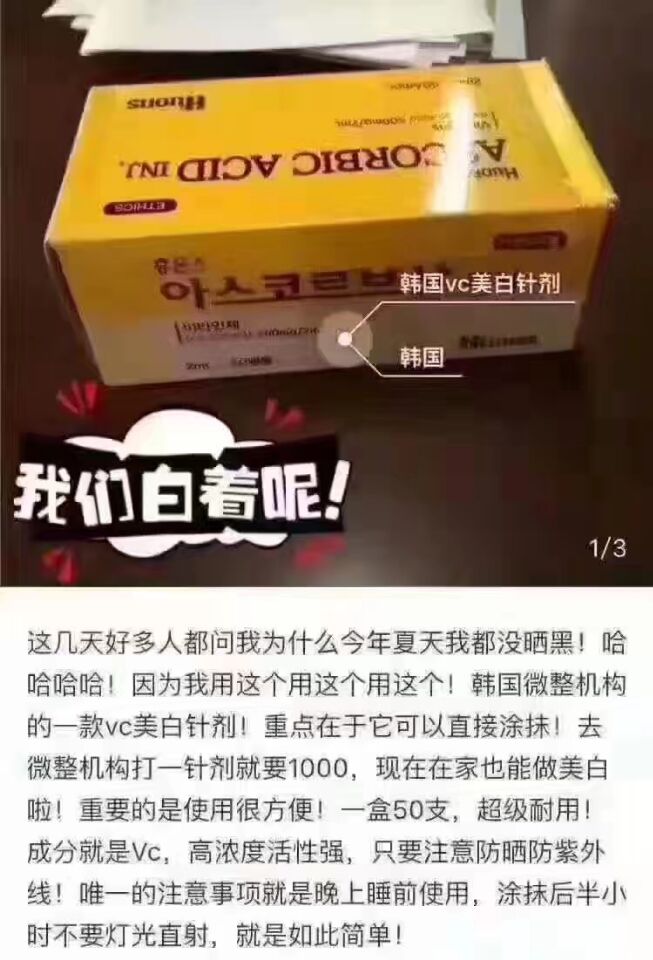 韩国VC面部美白,淡斑 1、注射 脸上斑点肤色不均匀,严重者可选择表皮注射,每次2至3支。三次后斑点明显淡掉。 2、外涂 早晚洁面后,选用1至2支,均匀整张脸,半个小时清洗即可。几支后皮肤明显白亮水嫩起来。 3、配合电动微针(推荐) 每星期两至三次,除了美白去斑外,还可以收缩毛孔,修复凹凸洞,嫩肤去细纹等 韩国淡斑美白Vc针,高浓度左旋Vc,2ml*50支 产品介绍: 一只2毫升高浓度Vc,晚上避光擦拭,一次2支,半个小时后洗掉,皮肤白白亮亮。不怕打针可以选择Vc美白淡斑针,韩国VC美白淡斑针,Vc的作用是延缓皮肤衰老有活力,淡斑、美白、去痘印VC帮你通通搞定。可涂抹,可配合滚针导入加面膜锁住营养不让氧化,半个小时后洗掉,皮肤白白亮亮,增白一个度,各种斑轻松解决。使用方法: 1、注射 配合水光针加美思满或加青春动能素,或加在蒂美妮提升针里或加在去斑针里的最佳搭档。顾客的反馈效果就是这么好,美白加祛斑,多效合一,脸上斑点肤色不均匀,严重者可选择表皮注射,每次2至3支。三次后斑点明显淡掉。 2、外涂 早晚洁面后,选用1至2支,均匀整张脸,半个小时清洗即可。几支后皮肤明显白亮水嫩起来。 3、配合微针(推荐) 每星期两至三次,除了美白去斑外,还可以收缩毛孔,修复凹凸洞,嫩肤去细纹等。韩国淡斑美白Vc针因其拥有先进成熟技术,给你带来意外的惊喜,还你一个光、亮、嫩、白的肌肤,成为颜值高的时尚达人。因其产品拥有惊人般的效果,必将拥有广大的市场,给你一个绝佳的商机,厂商提货一步到位的品牌代理,让你轻轻松松致富。有韩国淡斑美白Vc针,让你肌肤焕新不再是梦,让你创业之路更加平坦
