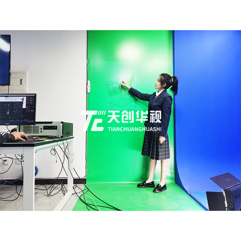 虚拟演播室采用先进的图形算法和技术研发出来的虚拟演播室系统。通过传感系统摄像机各种参数并传递给虚拟演播室计算机处理系统,该处理系统根据传感参数实时产生一个有空间感的虚拟场景,并与演播主体之间保持一致的空间关系。视频键器对摄像机获得的前景信号与虚拟演播室系统产生的背景信号进行处理,从而实现演播主体(播音员、演播人物等)与虚拟场景的合成。因为虚拟演播只需在一个蓝色背景下进行,利用它进行节目制作与播出,无需为不同的节目搭建不同的演播室或场景,所以在有效利用演播室资源方面,成本优势是显而易见的。还可以与非线性编辑系统结合使用,将虚拟演播的节目直接输出到非线性编辑系统中进行编辑播出,并可将编辑结果记录到网络共享存储器中,实现演播资源共享。虚拟演播室技术是在传统色键抠像技术的基础上,充分利用了计算机三维图形技术和合成技术,根据位置与参数,使三维虚拟场景的关系与前景保持一致,经过色键合成后,使得前景中的主持人看起来浸尽于计算机所产生的三维虚拟场景中,而且能在其中运动,从而创造出接近真实的、立体感很强的电视演播室效果。