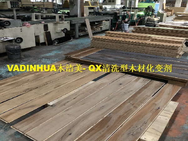 VADINHUA木洁美-QX清洗型木材化变剂通过改良添加MJB抗氧化功能助剂对木材单宁木质素进行抽提式析出螯合反应·从而改善和克服了传统木材化变药水易氧化,易返色,易受气温温度,地域温差,木材单宁含量析出等缺陷影响,其通过对木地板板材表面作简单涂刷或滚涂就能渗入木材纤维.通过木材自身所含的少量单宁酸即可产生一系列的化学反应改变让木材呈现出不同的自然颜色风格,二次通过清洗剂的氧化-还原反应让板材自身再次展现出不同的沧桑复古视觉变化,经处理后的板材具有板面颜色一致,纹理通透,自然干净,木纹层次感强,不易褪色等一系列优点.广泛用于欧橡 山核桃 色木,枫木 桦木 榆木 松木等树种冷色,暖色系木地板,木质家具 木质工艺品,木门等化变变色处理.