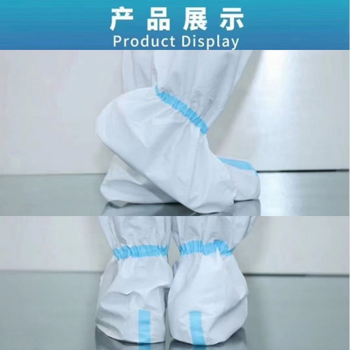 在使用之前将隔离鞋套展开,套上鞋套后,将袜子、裤脚塞入隔离鞋套后用绑带固定。经多人实际操作验证东贝一次性无纺布隔离鞋套在一次性使用中耐磨、防水、透气、隔离型好、高筒鞋套不下滑。