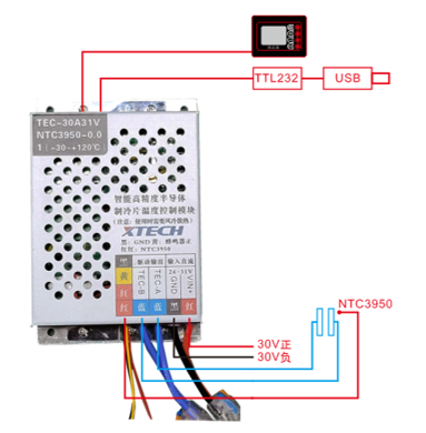 TEC-30A48V-NTC3950-0.01(-20~+120℃) 用户接口接线为6根连线,两根线接24V~48V供电输入的正负,两根线接NTC3950传感器,两根线接TEC,如下图所示。接线时首先连接24V~48V供电输入电源线和NTC3950,等到接通电源后,最后接入TEC。接线时,保证供电输入电源线、TEC输出线截面大4平方毫米。