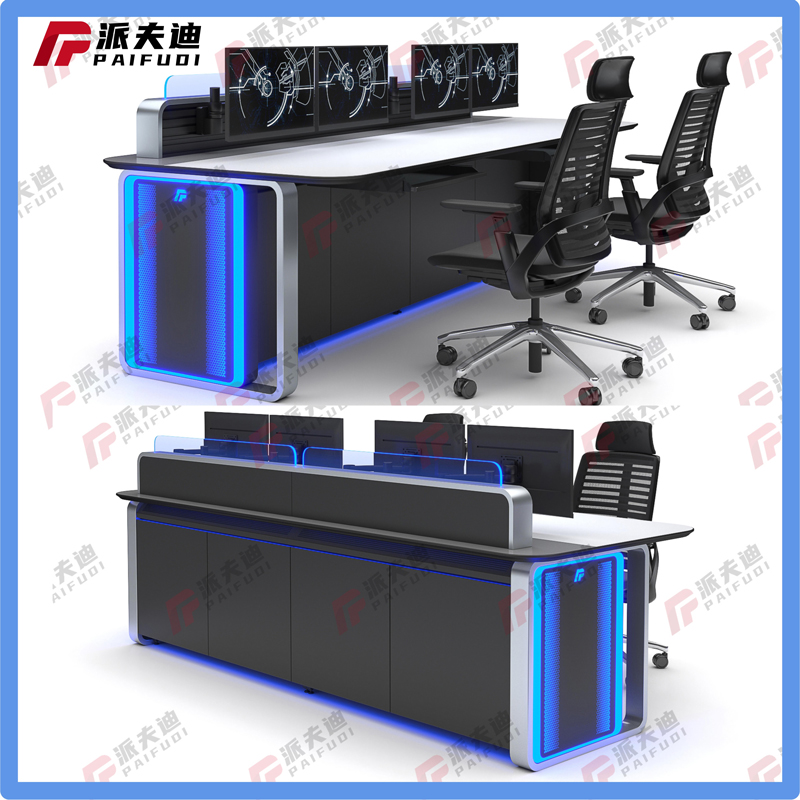 ⑦柜体上部(平台式除外)首层为倾斜面,与台面夹角为105度,从第二层起与台面夹角为90度。有利于操作员在长时间目视画面时眼睛不疲劳;