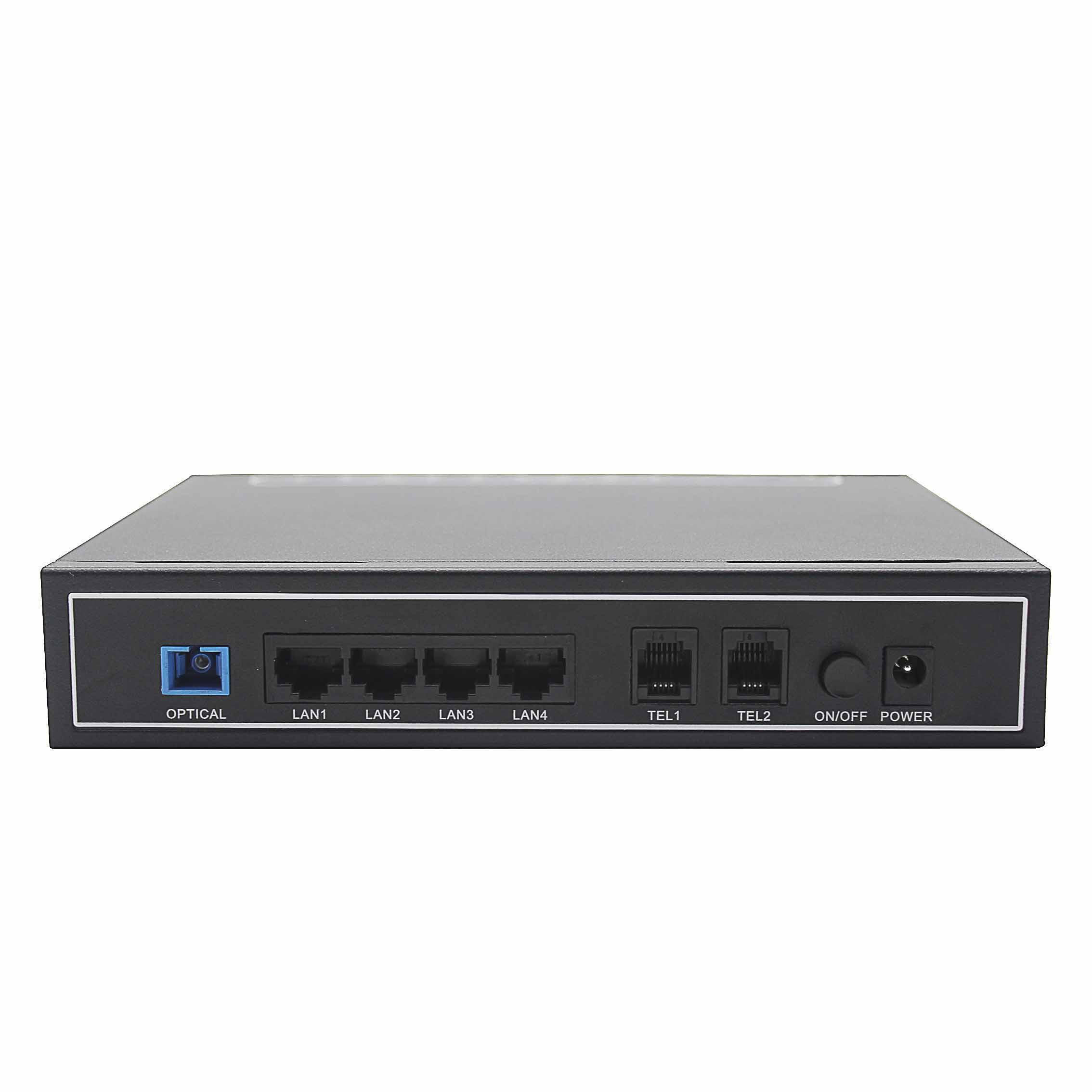 接口:硬件接口,从左到右对着接口方向看,接口顺序为:PON接口,网口1-4口,语音口1,语音口2,电源按钮,电源接口。