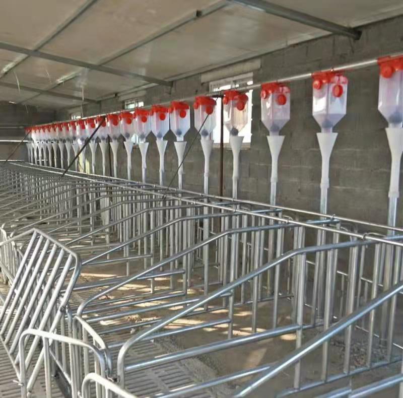 4、水管安装:上述¢20热镀锌管拉杆兼当水管,每2栏用三通连1根520 mm长¢15热镀锌管,底部用三通连接安装2只不锈钢饮水器,每10m安装1只¢15水嘴,其它包括猪舍内水管安装用材料;