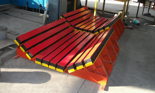 缓冲床是根据带宽由多条缓冲条组成,缓冲条由磨擦系数极低的且的高分子聚乙烯表层、弹性极好的缓冲橡胶、金属骨架、防松固定螺栓组件四部分组成。