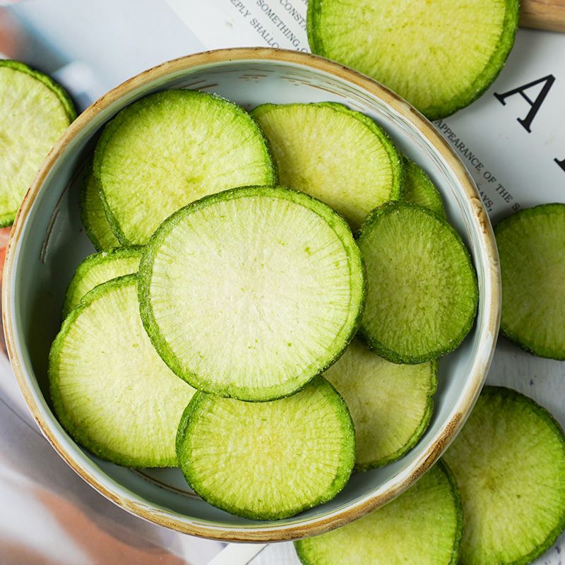 新鲜青萝卜,制作成果蔬脆保存了新鲜果蔬天然的色泽、形态和风味,又具有高纤维素的特点,无油腻感。