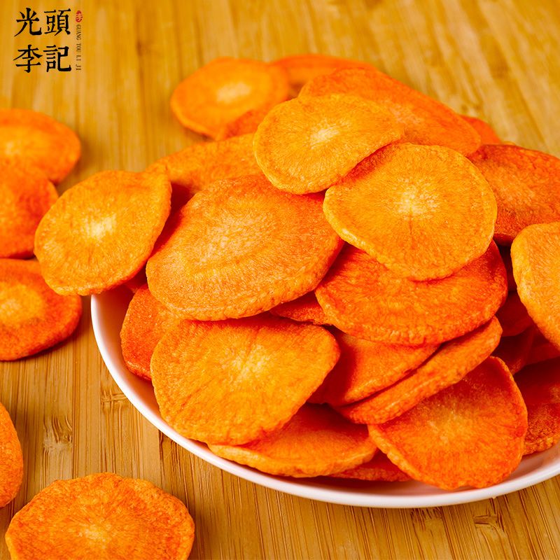 新鲜胡萝卜,制作成胡萝卜脆保存了新鲜胡萝卜天然的色泽、形态和风味,高颜值,香脆爽口。