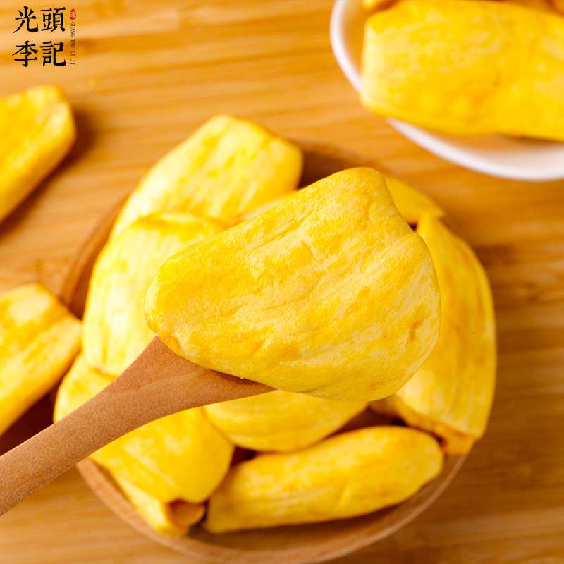 新鲜菠萝蜜,采用VF工艺制成菠萝蜜脆,锁住新鲜,锁住美味,使菠萝蜜脆保持原有的色、香、味、形,原滋原味,酥脆爽口,果香四溢,齿颊留香。