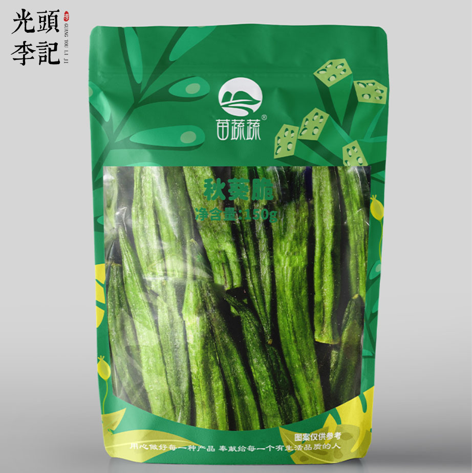 山东光头李记食品有限公司苗蔬蔬阴阳袋系列秋葵脆,VF工艺制作而成的秋葵脆,采用极简透明的包装,可以更加直观的看到产品的状态,外形、颜色、品质一目了然,能直接突出产品的优势和卖点,既能体现出果蔬脆的自然美感,又在视觉上直接让顾客对商品有一定的认知,便于顾客识别选购。透明开窗适合陈列展示,高颜值的果蔬脆色彩鲜艳,透过透明的包装,更能吸引顾客的目光尤其是小朋友的注意力,用颜值吸引目光,用美味征服人心。