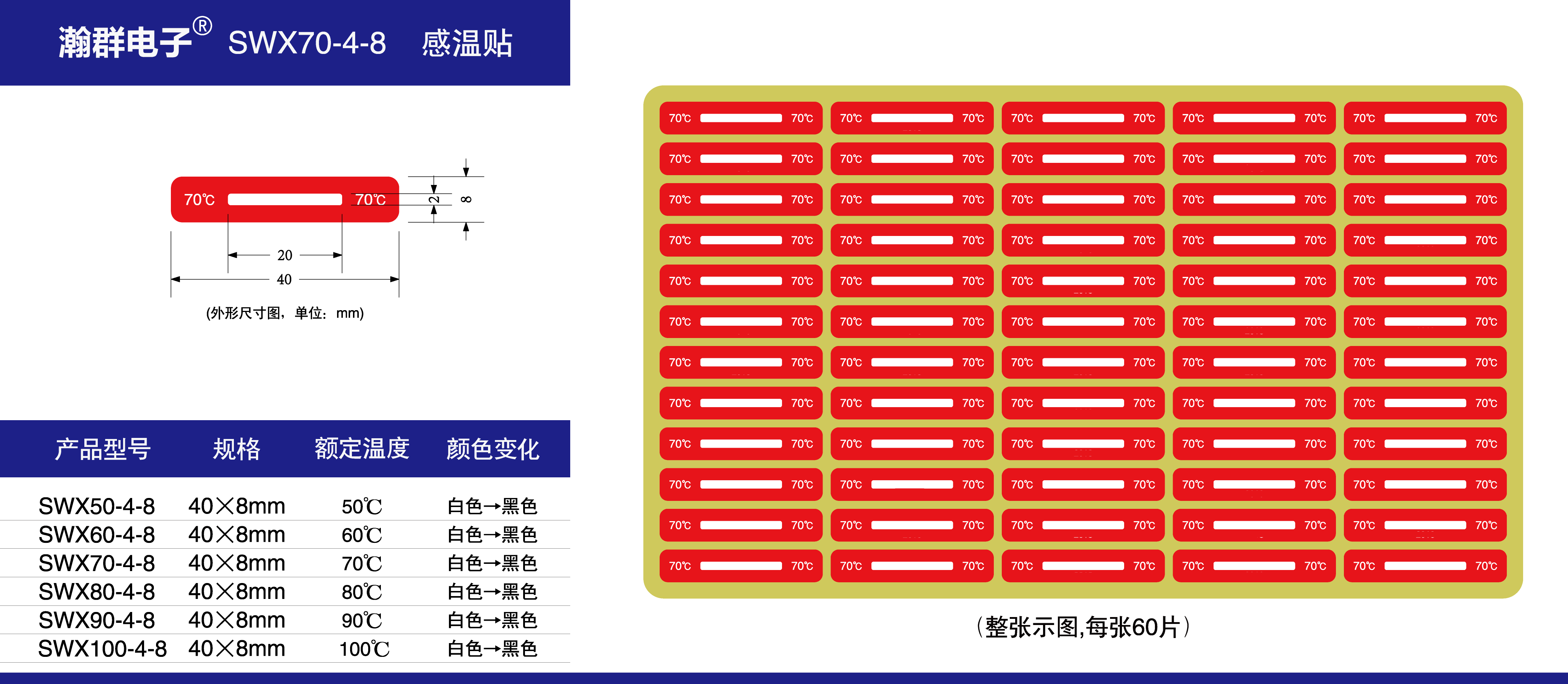 2.特殊需要可根据客户要求制作,如制作不同额定温度、不同超温颜色、不同规格的变色测温贴片。