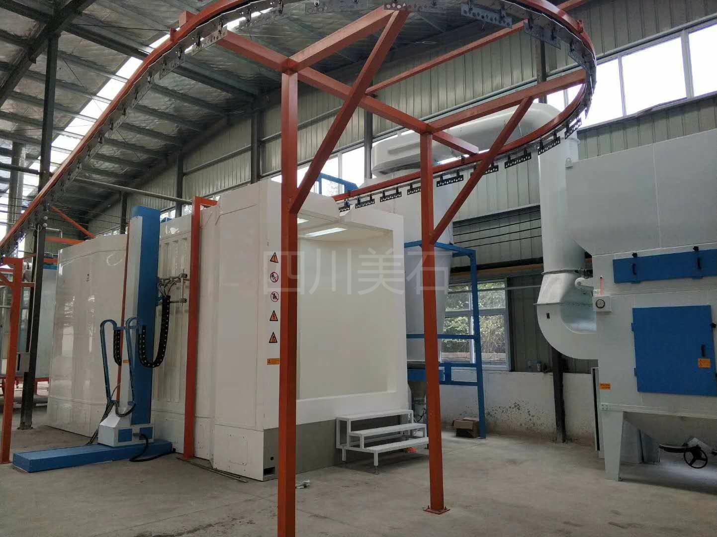 喷塑流水线主要配套设备:悬挂链输送机,不锈钢喷淋清洗剂,脱水炉,喷塑房,自动喷枪,升降机,隔离房,加热炉,固化烘干炉,废气处理设备等。