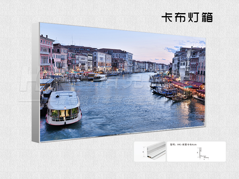 卡布灯箱是将广告画面喷绘在UV软膜上,灯箱由卡布灯箱铝型材边框,和高亮LED灯条,UV软膜布组成。