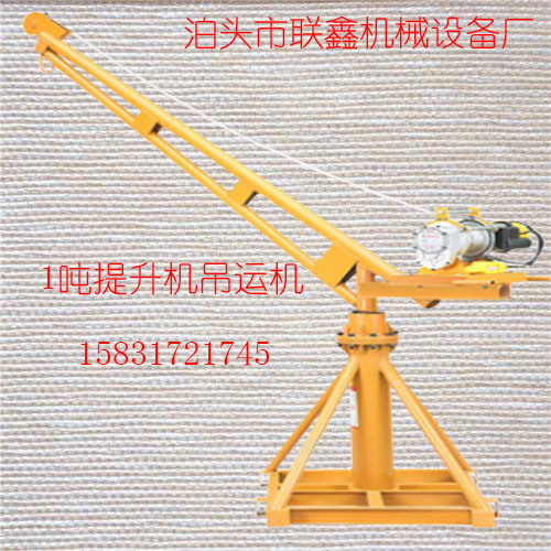 室外简易小型吊机来吊运这些重物,在吊运之前,先要了解平台尺寸与物品尺寸:1. 用户使用800公斤建筑小吊机来进行吊运,一吨小型随车吊货车,吊机自重在100公斤,吊臂可进行360度手动旋转,吊运机电机底座安装一台220V/380V电动提升机,钢丝绳长30米,功率4.0KW。2. 平台总长度3米,小型吊装机底座安装空间为1.6米,实际物品占用空间为1.4米(达不到1.4米)。3. 建筑小吊机被吊物体