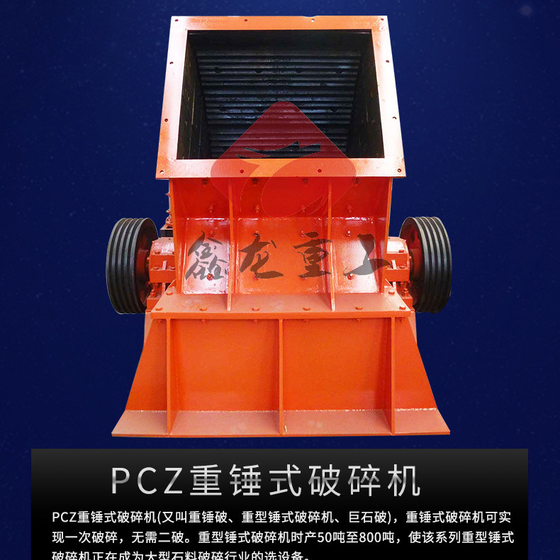 PCZ重锤式破碎机(又叫重锤破、重型锤式破碎机、巨石破),重锤式破碎机可实现一次破碎,无需二破。重型锤式破碎机时产50吨至800吨,使该系列重型锤式破碎机正在成为大型石料破碎行业的优良设备。