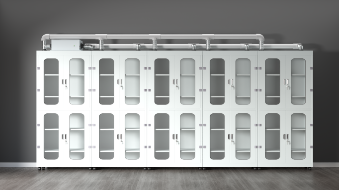 消毒净气(净化)器械柜药品柜配置:可以一柜一消毒净化器,也可多柜共用一台消毒净化器(通过柜顶管道连接)。