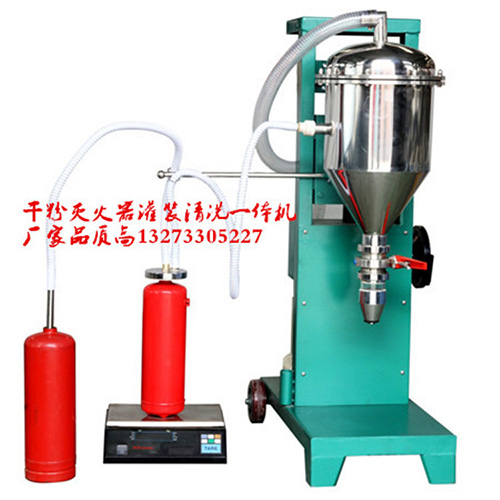 GFM型灭火器干粉灌装机是我厂参照粉类灌装机的优点结合实际灌装的特点,开发设计的新产品。它采用了真空射流技术,将干粉快速吸入被装筒体,配备高精度的T3806型称重显示仪及MP-T型打印机。使其灌装具备了自动化计量化同时利用真空所产生的负压对过滤器上的残余粉尘进行清理。本机集电子电器机械于一体,从而减轻了劳动强度,具有体积小、重量轻、能耗低、移动方便、操作简单、使用寿命长等特点,特别适用于干粉灭火器的粉灌装,也是其它粉类灌装行业的设备。