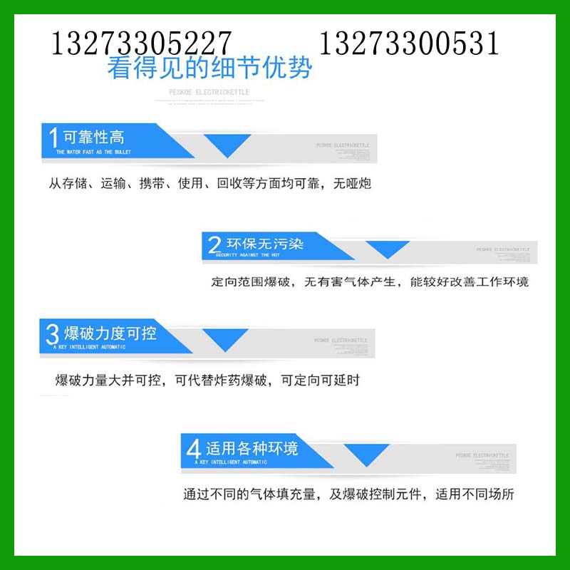 2:操作过程简单快速,从灌装到爆破结束的时间短。液态二氧化碳注入仅需1-3分钟,从开始到结束仅需4毫秒。能根据不同的爆破工程或场地选择不同型号或爆破力的产品,且能适应在不同的施工工作环境中进行使用能满足因地制宜的安装。