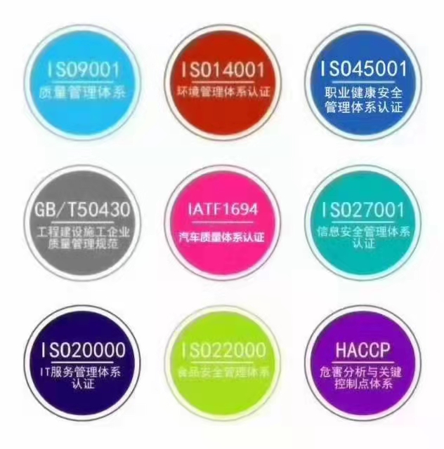 1、ISO体系认证类——ISO9001质量认证、ISO14001环境认证、ISO45001职业健康安全认证、ISO22000食品安全认证》、HACCP认证》、《绿色食品安全认证》、《绿色供应链认证》、《垃圾分类等级认证》、《物业服务认证》、《保安服务认证》、《餐饮服务认证》、《餐饮企业现场管理评价认证》、《清洁服务认证》、《售后服务认证(五星)》、《有害生物防制服务能力评价认证》、《生鲜农产品供应商服务规范认证;