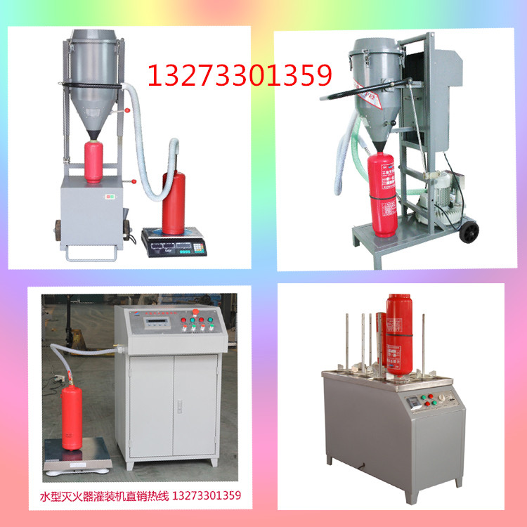 灭火器灌装机操作使用: 1、连接管路 首先将本机吸粉管与仓库的圆锥型储粉桶连接好,(储粉桶锥度一般为3:2用户可根据生产量自定储粉 桶的大小)再检查各连接管是否有松动。 2、保护装置 连接好干粉机的保护接线。称台接地线是为了消除静电而设置的。由于干粉灌装过程中产生静电,且对 称台传感器及显示仪干扰,所以必须接地。接地装置是连接电器与大地的过渡装置,称台接地线与埋入 地下的金属导体或导体组连接,接地电阻值不应大于4欧姆。此装置用于称台及显示仪消除静电干扰,经 多次实验是比较有效的一种方法。 3、安装电源 接通电源,本机采用单相两线制供电。若经漏电保护器接出的电源,单相两线必须经同一个漏电保护器 输出。试机先点动几次【运行】按钮,查看真空泵电机是否按机体所标箭头方向旋转,然后把电机与真 空泵传动三解带上好(由于出厂前已将三角带卸下,电机必须按箭头方向转动)。把灭火器筒体放在机体 台面上,筒体上口和下粉口对接好,不得漏气,过滤器总成阀门打开,手动吸气阀门。