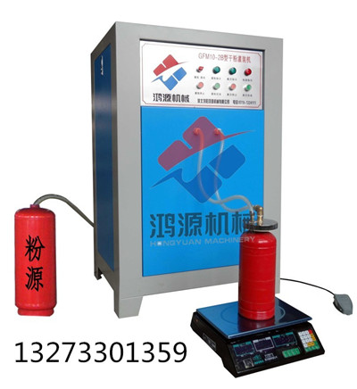 干粉灭火器灌装机操作使用: 1、连接管路 首先将本机吸粉管与仓库的圆锥型储粉桶连接好,(储粉桶锥度一般为3:2用户可根据生产量自定储粉 桶的大小)再检查各连接管是否有松动。 2、保护装置 连接好干粉机的保护接线。称台接地线是为了消除静电而设置的。由于干粉灌装过程中产生静电,且对 称台传感器及显示仪干扰,所以必须接地。接地装置是连接电器与大地的过渡装置,称台接地线与埋入 地下的金属导体或导体组连接,接地电阻值不应大于4欧姆。此装置用于称台及显示仪消除静电干扰,经 多次实验是比较有效的一种方法。 3、安装电源 接通电源,本机采用单相两线制供电。若经漏电保护器接出的电源,单相两线必须经同一个漏电保护器 输出。试机先点动几次【运行】按钮,查看真空泵电机是否按机体所标箭头方向旋转,然后把电机与真 空泵传动三解带上好(由于出厂前已将三角带卸下,电机必须按箭头方向转动)。把灭火器筒体放在机体 台面上,筒体上口和下粉口对接好,不得漏气,过滤器总成阀门打开,手动吸气阀门。