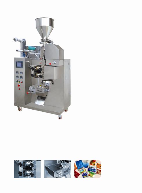 具有一组纵封热辊筒、一组横封热辊筒。封口采用辊筒方式封口、花纹采用完整、连续的棋盘纹。被包装的物料通过计量装置落入包装袋中。