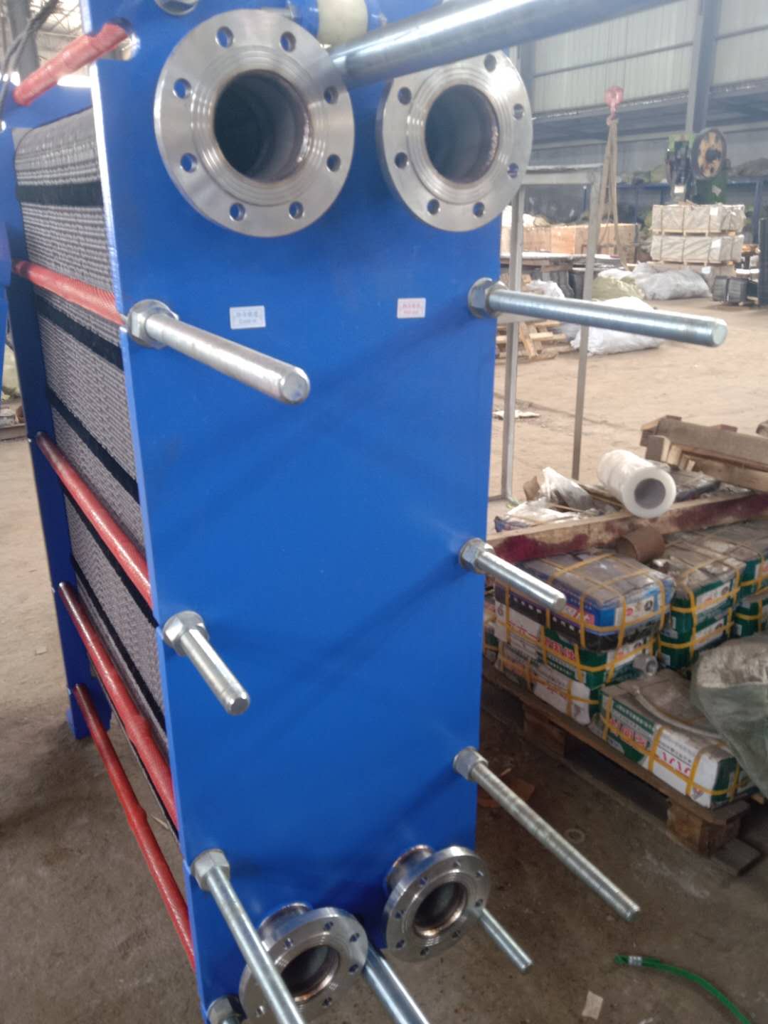 板式换热器是由一系列具有一定波纹形状的金属片叠装而成的一种新型高效换热器。各种板片之间形成薄矩形通道,通过板片进行热量交换。板式换热器是液-液、液-汽进行热交换的理想设备。它具有换热效率高、热损失小、结构紧凑轻巧、占地面积小、安装清洗方便、应用广泛、使用寿命长等特点。在相同压力损失情况下,其传热系数比列管式换热器高3-5倍,占地面积为管式换热器的三分之一,热回收率可高达90%以上。