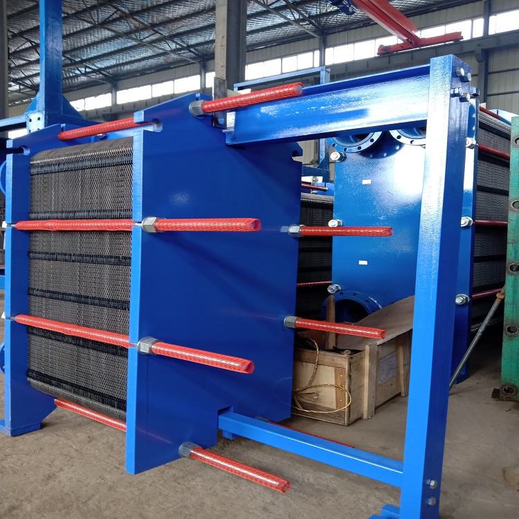 水水板式换热器是一组波纹金属板组成,板上有四个角孔,供热交换的两种液(气)体通过。金属板片安装在一个侧面有固定板和活动压紧板的框架内,并用夹紧螺栓夹紧。板片上装有密封垫片,将流体通道密封,并且引导流体交替地流至各自的通道内。波纹板不仅提高了湍流程度,并且形成许多支撑点,足以承受介质间的压力差。金属板和活动压紧板悬挂在上导杆,并由下导杆定位,而杆端则固定在支撑柱上。