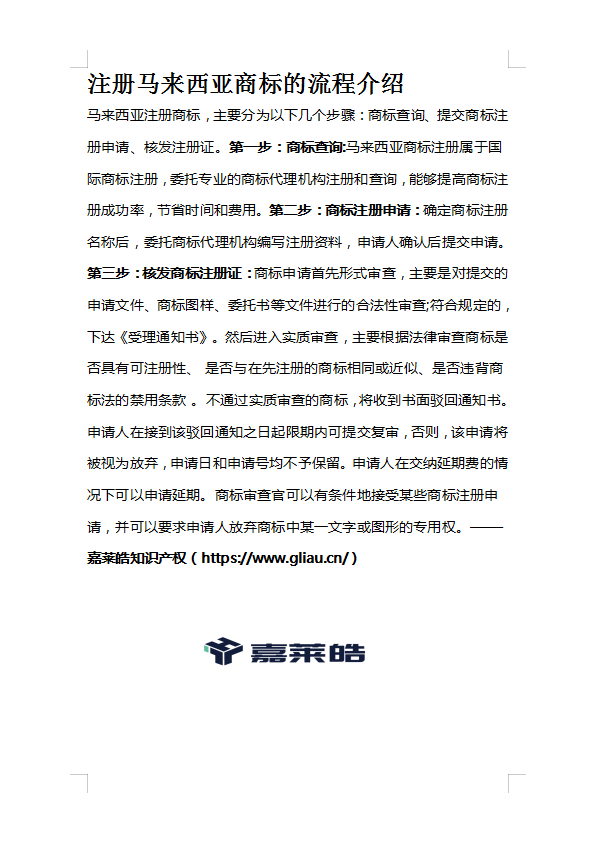 第三步:核发商标注册证:商标申请首先形式审查,主要是对提交的申请文件、商标图样、委托书等文件进行的合法性审查;符合规定的,下达《受理通知书》。然后进入实质审查,主要根据法律审查商标是否具有可注册性、 是否与在先注册的商标相同或近似、是否违背商标法的禁用条款 。 不通过实质审查的商标,将收到书面驳回通知书。申请人在接到该驳回通知之日起限期内可提交复审,否则,该申请将被视为放弃,申请日和申请号均不予保留。申请人在交纳延期费的情况下可以申请延期。商标审查官可以有条件地接受某些商标注册申请,并可以要求申请人放弃商标中某一文字或图形的专用权。——嘉莱皓知识产权