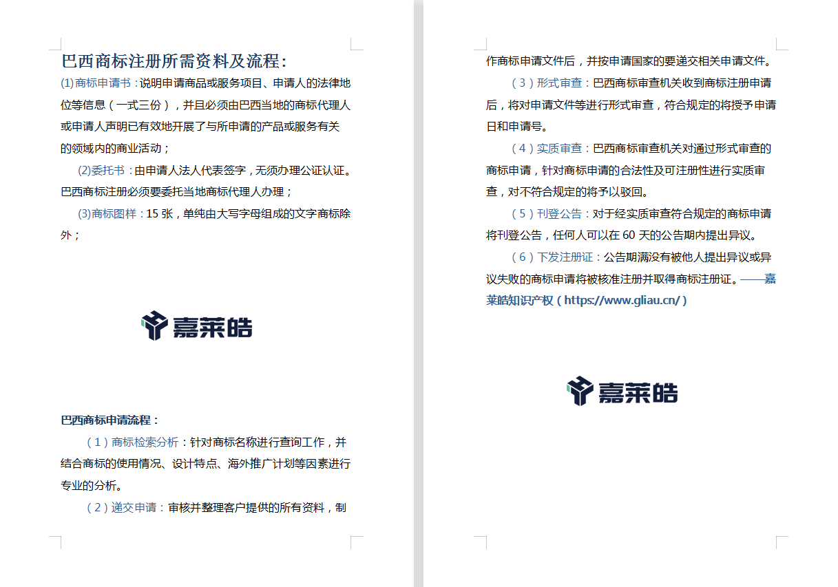 巴西商标注册所需资料及流程: (1)商标申请书:说明申请商品或服务项目、申请人的法律地位等信息(一式三份),并且必须由巴西当地的商标代理人或申请人声明已有效地开展了与所申请的产品或服务有关的领域内的商业活动; (2)委托书:由申请人法人代表签字,无须办理公证认证。巴西商标注册必须要委托当地商标代理人办理; (3)商标图样:15张,单纯由大写字母组成的文字商标除外;巴西商标申请流程: (1)商标检索分析:针对商标名称进行查询工作,并结合商标的使用情况、设计特点、海外推广计划等因素进行专业的分析。 (2)递交申请:审核并整理客户提供的所有资料,制作商标申请文件后,并按申请国家的要递交相关申请文件。 (3)形式审查:巴西商标审查机关收到商标注册申请后,将对申请文件等进行形式审查,符合规定的将授予申请日和申请号。 (4)实质审查:巴西商标审查机关对通过形式审查的商标申请,针对商标申请的合法性及可注册性进行实质审查,对不符合规定的将予以驳回。 (5)刊登公告:对于经实质审查符合规定的商标申请将刊登公告,任何人可以在60天的公告期内提出异议。 (6)下发注册证:公告期满没有被他人提出异议或异议失败的商标申请将被核准注册并取得商标注册证。——嘉莱皓知识产权