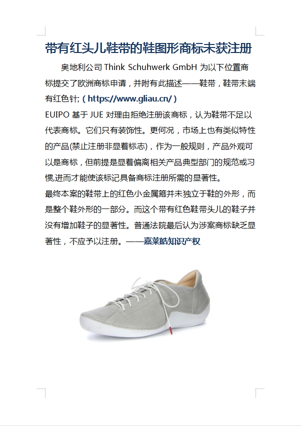 最终本案的鞋带上的红色小金属箍并未独立于鞋的外形,而是整个鞋外形的一部分。而这个带有红色鞋带头儿的鞋子并没有增加鞋子的显著性。普通法院最后认为涉案商标缺乏显著性,不应予以注册。——嘉莱皓知识产权