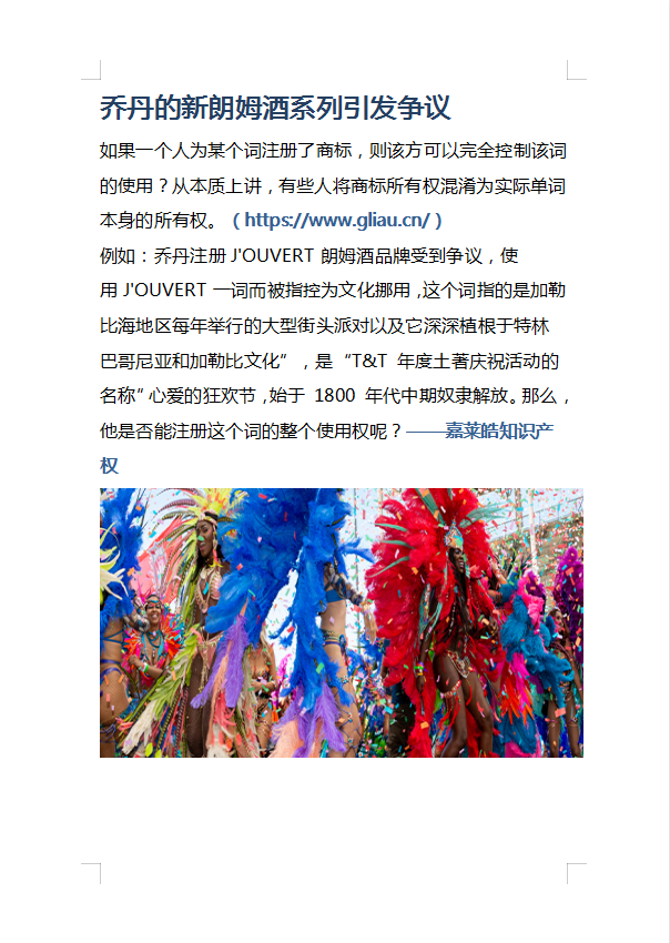 例如:乔丹注册 J'OUVERT 朗姆酒品牌受到争议,使用 J'OUVERT 一词而被指控为文化挪用,这个词指的是加勒比海地区每年举行的大型街头派对以及它深深植根于特林巴哥尼亚和加勒比文化”,是“T&T 年度土著庆祝活动的名称”心爱的狂欢节,始于 1800 年代中期奴隶解放。那么,他是否能注册这个词的整个使用权呢?——嘉莱皓知识产权