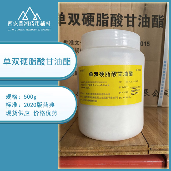 本品为单、二、三硬脂酸和棕榈酸混合甘油酯。由硬脂酸与过量甘油通过酯化反应制得,或由氢化植物油与甘油在催化剂的作用下,经过醇解反应制得。含单甘油酯应为40.0%~55.0%,二甘油酯应为30.0%~45.0%,三甘油酯应为5.0%~15.0%。性状:本品为白色或类白色的蜡状颗粒或薄片。