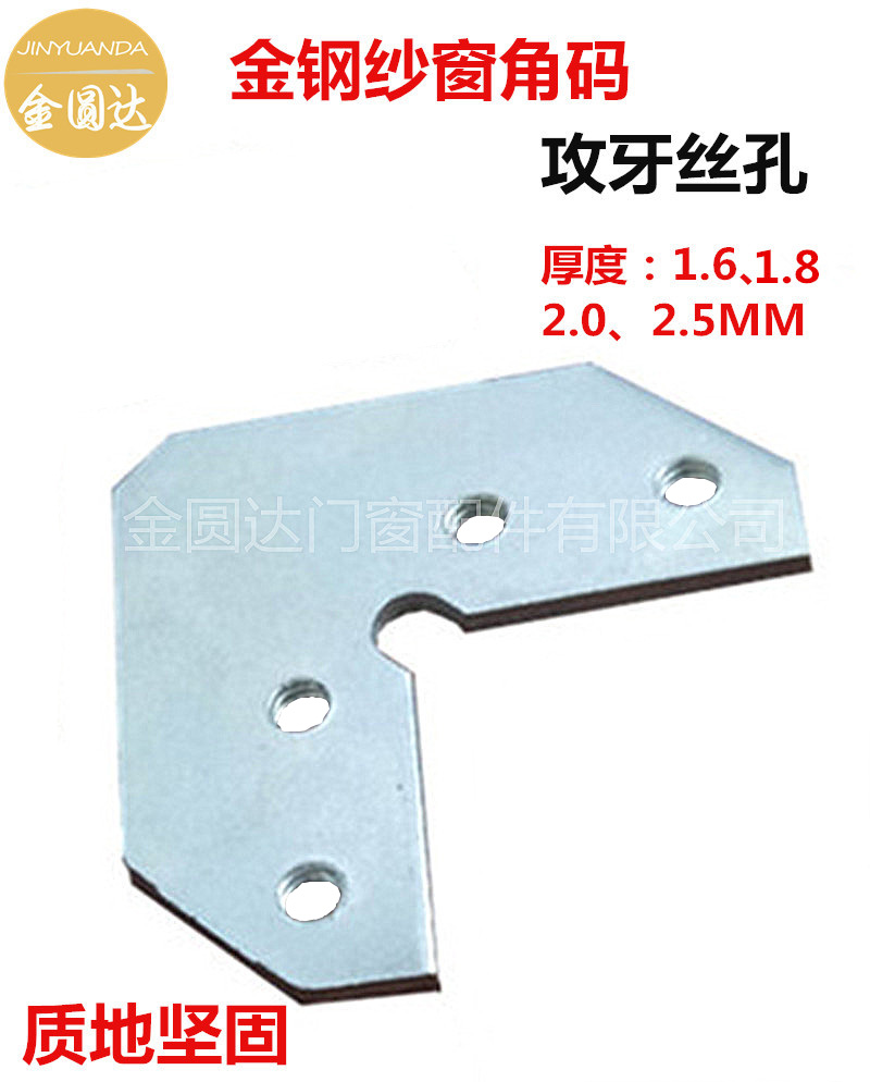 产品名称:纱窗角码 产品别名:金钢纱窗角码、片纱护角、钢丝网固定铁角 材质:锌铁 表面处理:原色打磨 包装数量:1000片/件 包装方式:纸箱打扎带 较小批量:1000片 发货周期:5000片以下3天交货,以上一周内发货 产品性能用途:该品主要采用热镀锌铁板,使用精密分条机把材料分成条卷状,然后在高速冲床连续模冷压下成型,再经过磨边去除毛刺,归类放置,包装等数道工序制作而成。 该产品广泛用在铝塑门窗外窗金钢纱窗加固连接作用。本品规格多样,常用的宽度18.2MM,厚度1.6-2.5MM,目前常用的的规格对应都有**,其它非常规规格您也可以定制。 公司简介:我司座落在美丽现代化城市东莞市,此处交通便利四海客户云集。 公司主要经营:门窗配件、门窗连接片、组角片、加固片、卡位固定片、月牙锁、纱窗四孔角码、塑钢窗脚轮、合页、窗撑、插销、包边条接头夹子等五金冲压件。