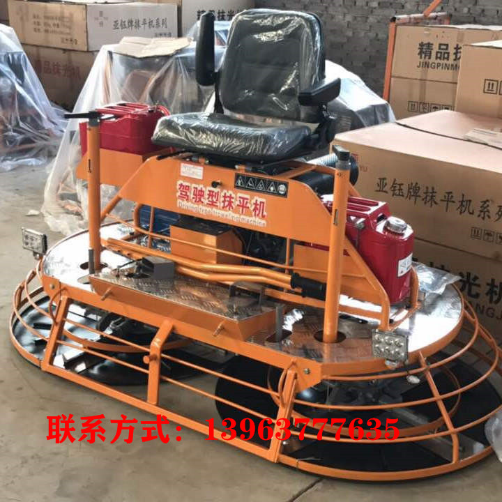 它是一种混凝土表面粗、精抹光机具。经过机器施工的表面较人工施工的表面更光滑、更平整,能极大提高混凝土表面的密实性及耐磨性,并在功效上较人工作业提高工作效率10倍以上。地面抹光机可广泛用于高标准厂房、仓库、停车场、广场、机场以及框架式楼房的混凝土表面的提浆、抹平、抹光。是混凝土施工中的先选工具。 座驾式抹光机参数: