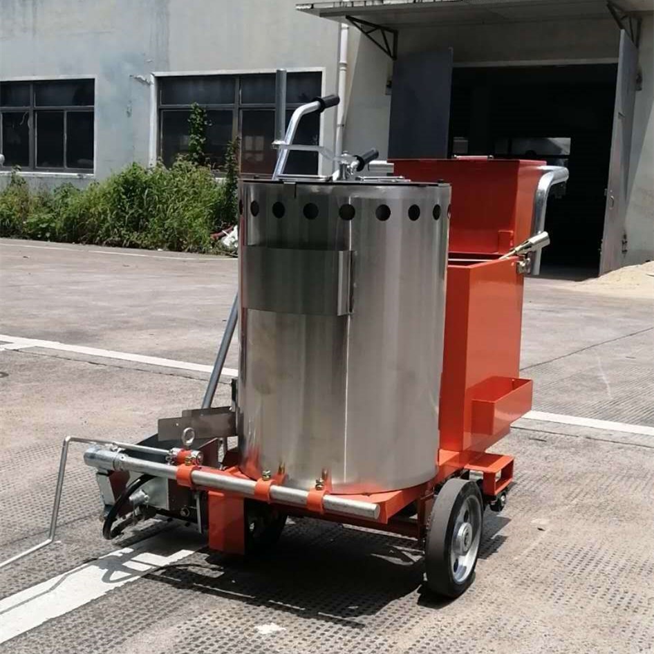 山东金尊小型划线机车体轻巧,结构紧凑,外形美观;升降式把手设计,操作者可根据需要作出调整;玻璃微珠自动散播器;保温加热桶可拆卸设计,合理搅拌轴设计,解决了搅拌桶经常存料的现象;可调式指针,提高工作效率;采用高精度钢板知道而成的涂敷斗,耐高温,耐腐蚀,不易变形,加热快等优点;采用铸铁与进口橡胶特殊制成的车轮,轻便,结实,耐用。