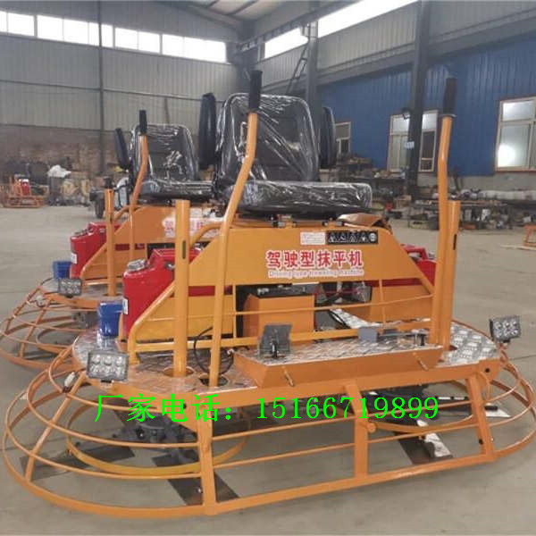 座驾式汽油路面抹光机的操作很大程度上降低了劳动强度,提高了工作效率,具有双盘,重量更大,对地面具有更好的压实效果,施工效果明显高于其它施工机器,可同时安装两张提浆圆盘,进行快速提浆,机械式转向操作系统,反应灵敏,控制轻松自如,配备金尊、力帆电启动发动机,提供强劲可靠的动力,操作稳定。独特的安全手柄可使操作员安全控制,操作自如。可调节的手柄让操作员感觉到舒适,减少疲劳感。