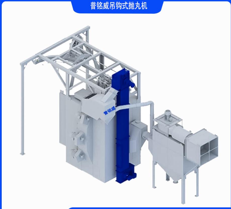 吊钩式抛丸机是以单个吊钩为工件的运载工具。每台设备一般设1~3个吊钩,每次一个钩件在清理室内清理,其余钩件在室外装、卸料,间歇作业。本类设备有以下特点:1)与吊链式清理机一样,工件在悬挂、旋转状态下清理,受抛面积大、清理效果好清理大件、复杂件时不需翻身,简化了操作。