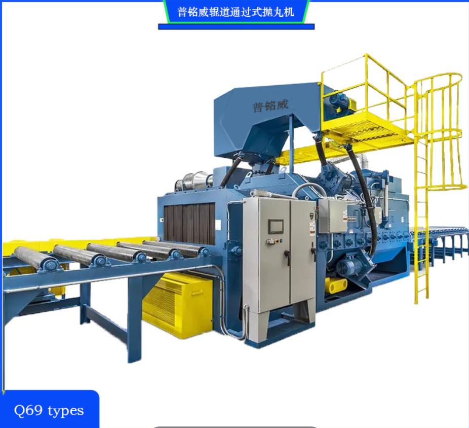 辊道通过式抛丸机是以贯穿清理室的机动辊道为铸件的运载装置,铸件在道上边前进,边接顶部或侧面抛丸器的抛射清理,以连续通过方式作业。此类设备用途广泛,目前主要用于钢材预处理和长形钢结构件后处理中的除锈处理,也用于长形件、扁平薄壁件和怕碰撞、易裂件等铸件的清理,还用于建筑业混凝土和石材的表面抛丸处理。
