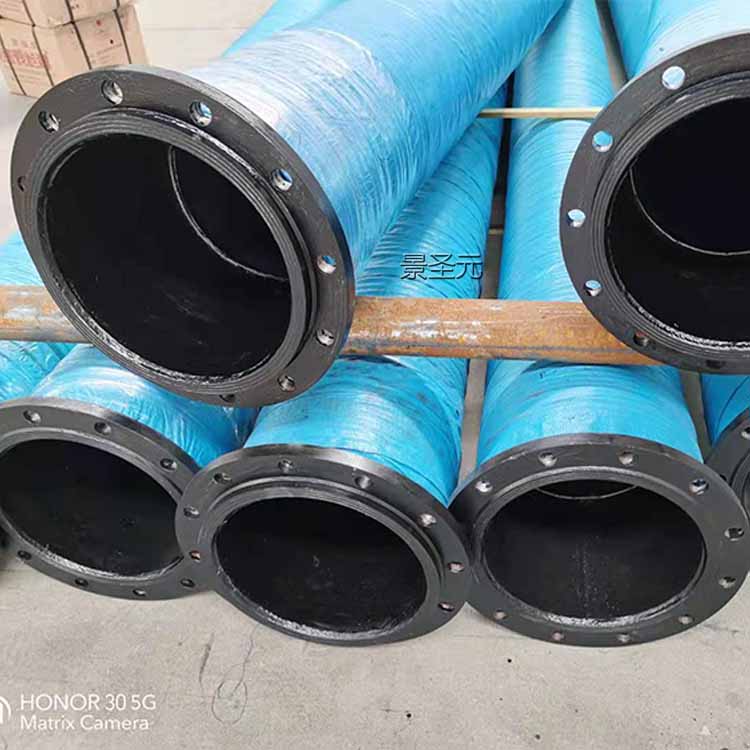 大口径胶管用以输送气体、液体、浆状或粒状物料的一类管状橡胶制品。大口径胶管由内外胶层和骨架层组成,骨架层的材料可用棉纤维、各种合成纤维、碳纤维或石棉、钢丝等。一般胶管的内外胶层材料采用天然橡胶、丁苯橡胶或顺丁橡胶;耐油胶管采用氯丁橡胶、SBR橡胶;耐酸碱,耐高温胶管采用乙丙橡胶、氟橡胶或硅橡胶等。大口径胶管的内胶层直接承受输送介质的磨损、侵蚀,且防止其泄漏;钢丝骨架排吸胶管外胶层保护骨架层不受外界的损伤和侵蚀;骨架层是胶管的承压层,赋予管体强度和刚度。大口径胶管的工作压力取决于骨架层的材料和结构。大口径胶管按其骨架层材料和结构可分为全胶胶管(无织物材料)、夹布胶管(骨架层为布层,)、吸引胶管(布层外还有一层金属螺旋线,)、编织胶管(骨架层为编织的钢丝或织物,)、缠绕胶管(骨架层为钢丝或线绳缠绕层,)、针织胶管(骨架层为针织物,)、短纤维胶管(短纤维与橡胶共混压而成)。其中吸引胶管在负压下工作,钢丝编织胶管或缠绕胶管能承受80~600MPa乃至更高的压力。吸排泥浆大口径胶管适用于水、压缩空气和非腐蚀性液体的输送,广泛应用于工业、建筑业、农业等领域;工作压力:10-15bar,18bar,20bar和25bar;温度范围在:-20℃--45℃环境下使用;内胶:光滑,SBR合成橡胶;外胶:光滑(表面布纹),抗老化、耐臭氧的EPDM合成橡胶。