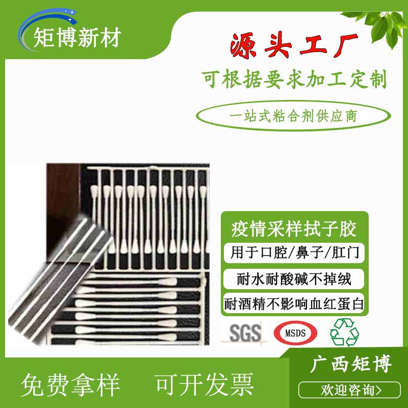 广西矩博拭子植绒胶水,是一款专门研发用于拭子塑料杆头部植绒使用的胶水。采用丙烯酸聚合而成的,不含甲醛,苯等有害人体健康物质。具有耐水、耐黄变、耐老化、耐酒精、耐磨损等特性。