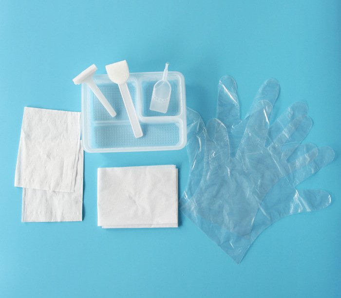 本产品由主要配置:膜手套、和选用配置:包布、卫生纸、滑石粉、海绵刷、物品盒、医用无布敷料、纱布块组成。产品应无菌,经环氧乙烷灭菌后环氧乙残量应不大于10ug/g.一次性使用