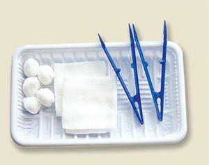 手套、一次性使用灭菌橡胶外科手套、医用镢子手术刀片、酒精棉球 碘伏棉球、脱脂棉球、托盘、包布组成。产品应无菌.经环氧乙烷灭菌后,