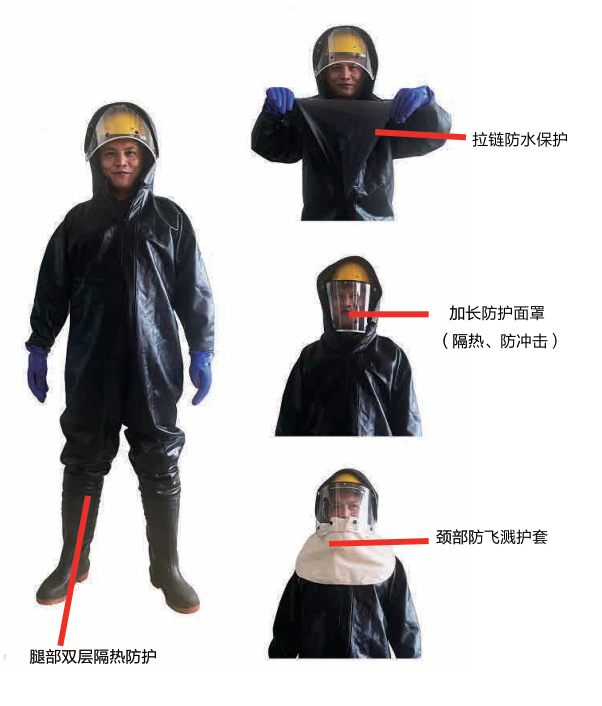 连体式设计,拉链部分防水处理,带面部防护安全帽,四肢活动灵活。配合防水面罩使用,穿脱方便,隔热效果好。