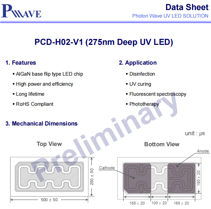 PW深紫外PCD-H02-V1UVC芯片5mW275nm
