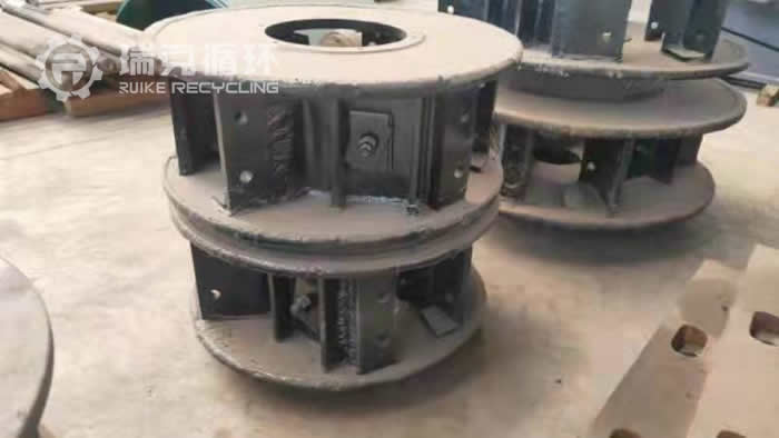 转子使用6个月后由于保护不当磨损严重无法在现场简修,需要返瑞克公司大修,经检查应该是中间锥冒没及时更换,出料方向严重偏移导致叶轮下盘及立板严重磨损,上盘直径明显大于下盘50mm,如下图所示