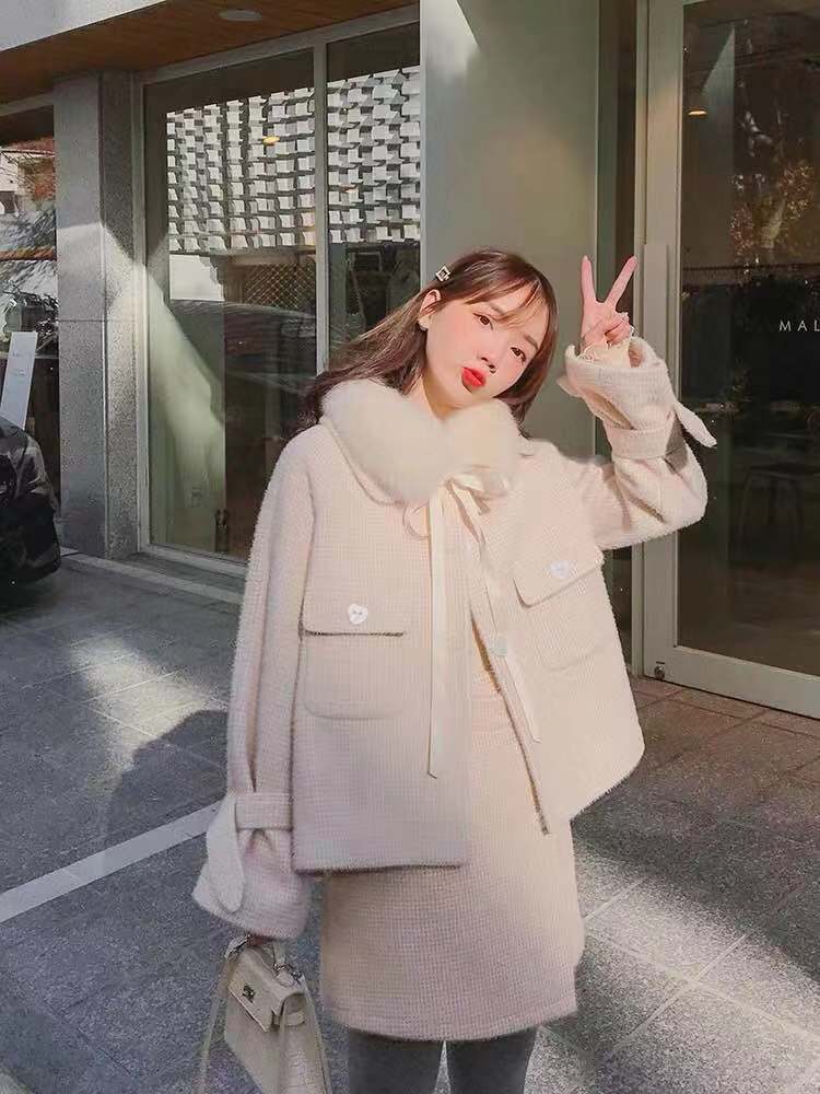 它的面料做了小小的格纹,一眼看上去就质感满满两件套的套装比较方便,不用费心搭配,上衣是小外套短款微宽松,领口翻领设计,搭配狐狸毛领,系带蝴蝶结