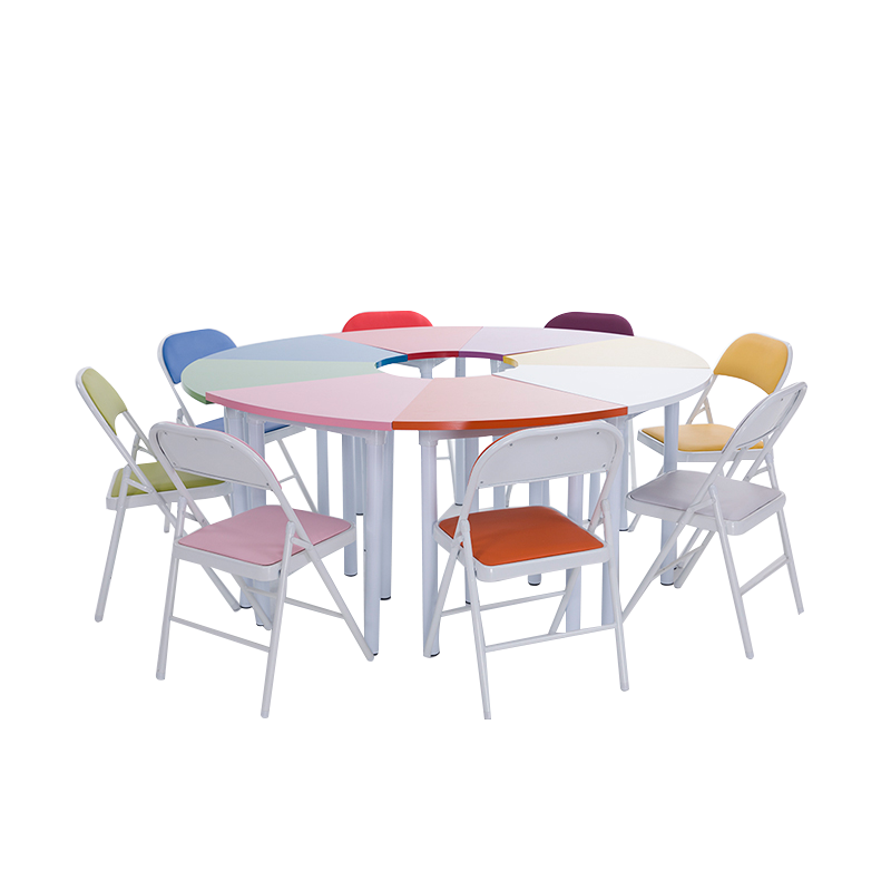 团体活动桌在团体活动是建设良好集体的重要组成部分和最重要的内容。团体的共同努力目标要靠团体每个成员参与共同的活动而实现。团体的形成,需要通过一系列教育活动,而团体活动的有效开展,可促使集体目标的实现、集体纪律的增强、集体友谊的发展,因而也在一定程度上标志着集体的形成、发展、巩固。一套包含:扇形桌8 张,8把椅子。8种颜色,可供8人进行活动。组合成圆形外径:1.8米。团体活动桌高度:70cm;团体活动椅高度:45-50cm。