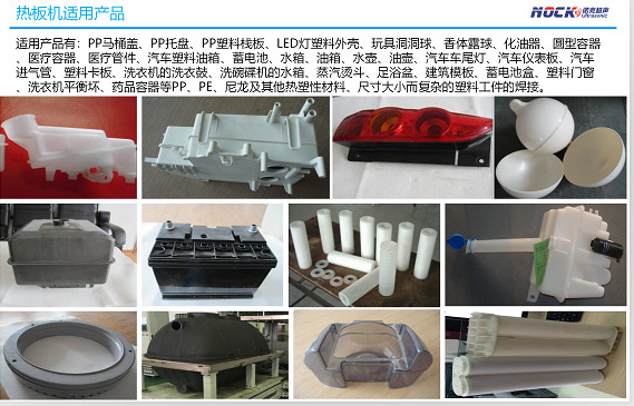 我们的热板焊接设备曾焊接的产品包括:汽车塑料油箱蓄电池水箱、油箱、水壶、油壶专用焊接机,活性碳罐焊接机,汽车塑料油箱蓄电池车尾灯仪表板进气管塑料卡板洗衣机的洗衣鼓洗碗碟机的水箱过滤器蒸汽烫斗足浴盆碳罐、制动液罐过滤器热汽油过滤器滤清器......