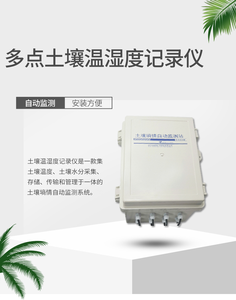 土壤温湿度记录仪又名土壤墒情监测站是一款集土壤温度、土壤水分采集、存储、传输和管理于一体的土壤墒情自动监测系统。整机由多通道数据采集仪、土壤水分传感器、土壤温度传感器、计算机软件组成。本系统主要以《土壤墒情监测规范SL000-2005 中华人民共和国水利行业标准》等文件为依据,根据实际需要进行适当修改,并整合若干组件而形成的土壤温湿度在线监测系统。