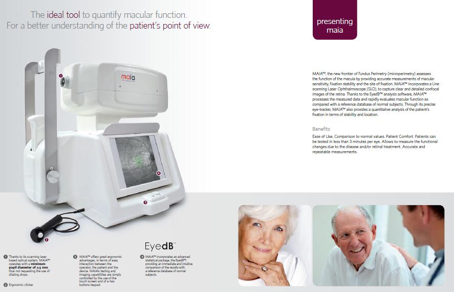 MAIA黄斑功能评估仪:黄斑是眼底视网膜视觉最敏锐的部位。黄斑功能评估仪与一般传统视野计不同,它可测量黄斑部的每一点对光的敏感度,也可同步取得实时视网膜影像,提供更精确视网膜功能与视网膜结构的关系。黄斑部功能整体评估,对侦测黄斑部病变的发生及黄斑部功能的影响非常重要。
